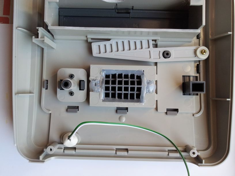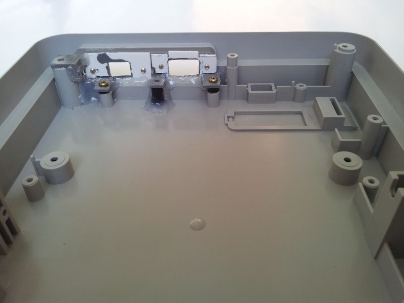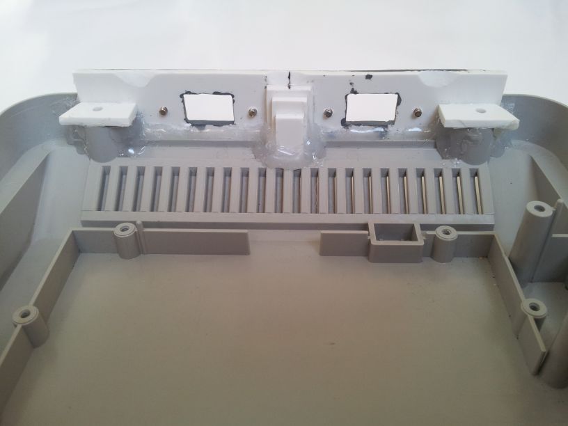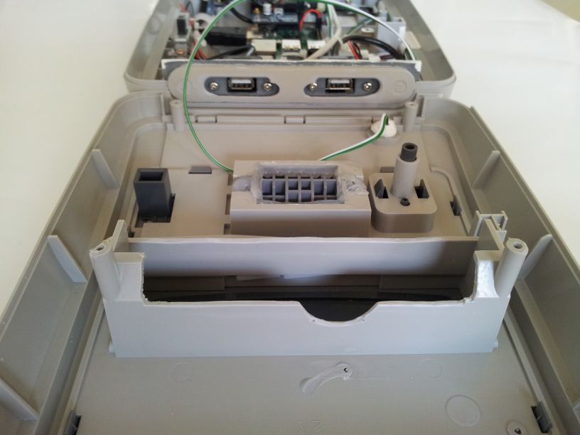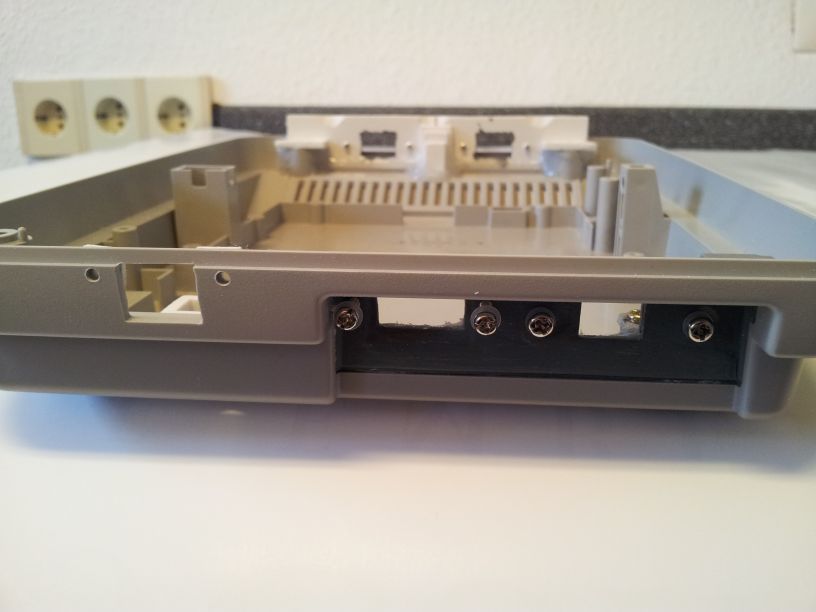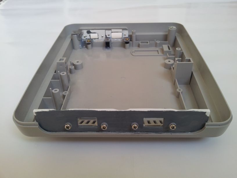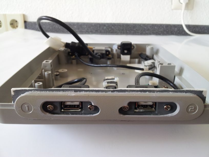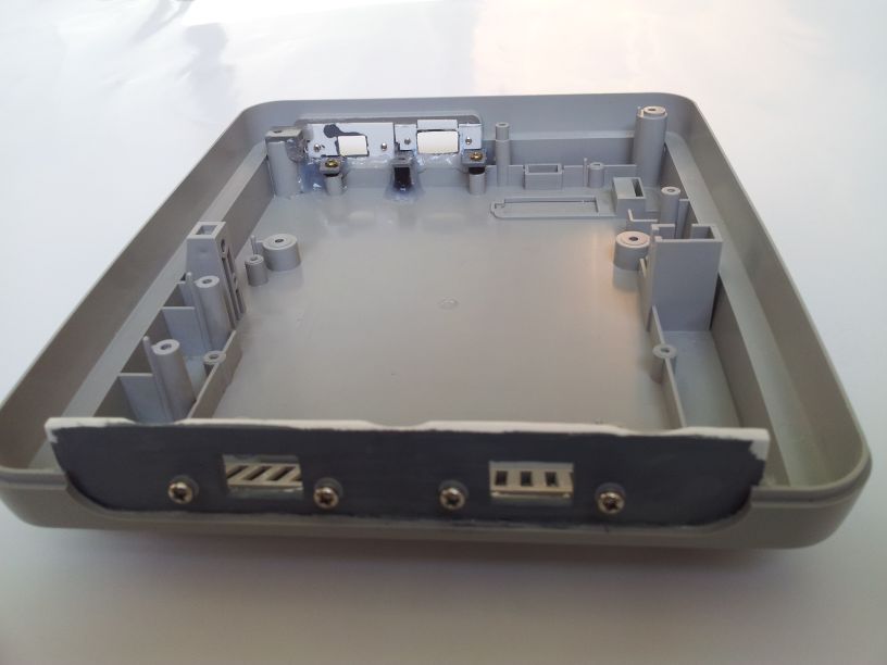 An der Vorderseite ist eine Frontblende aus Polystyrol mit Ausschnitten für zwei USB-Buchsen eingepasst. Die drei Millimeter dicke Blende ist mit Plastikklebstoff am unteren Gehäuseteil befestigt und mit Heißkleber stabilisiert. In der Mitte sind Stützteile aus Polystyrol, an den Seiten sind die Originalschraubenführungen wiederverwendet. Die Löcher nehmen die alten Schrauben auf, welche die untere und obere Gehäusehälfte verbinden.