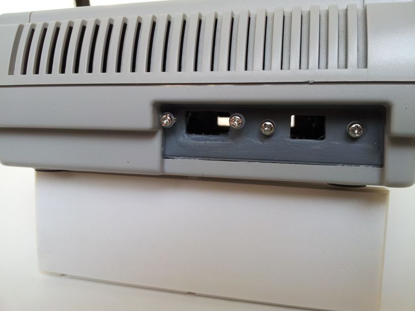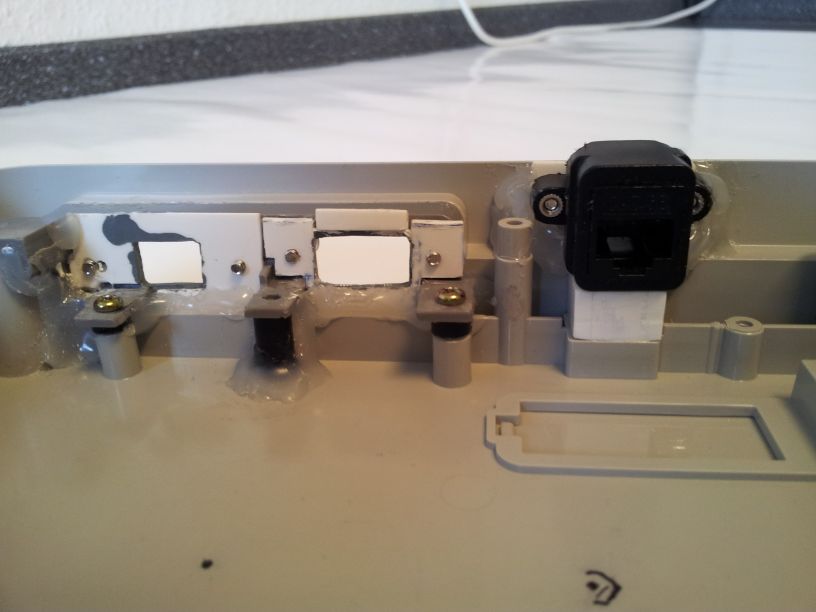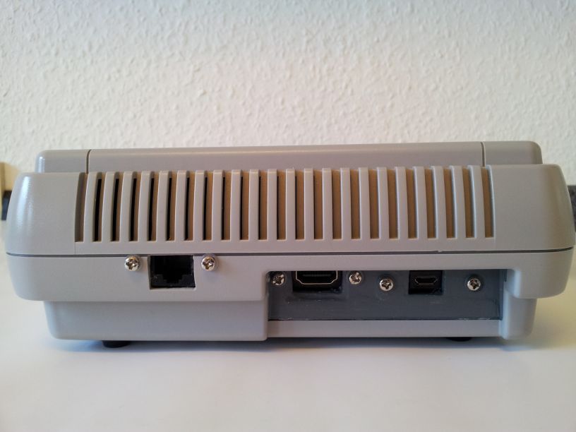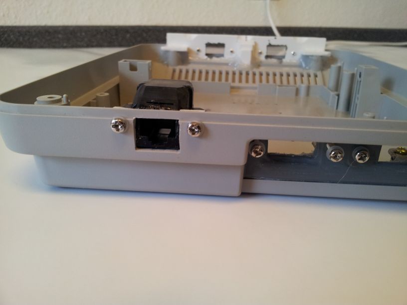 Der rückwärtige Originalblock, an dem sich die Stromversorgung, der Antennenausgang (RF) sowie der alte Multi-Out befinden, muss einigermaßen aufwendig bearbeitet werden. Er wird beschnitten und gefräst, so dass eine USB-Micro-Buchse sowie eine HDMI-Buchse daran befestigt werden können. Multi-Out hat glücklicherweise schon ähnliche Ausmaße wie eine HDMI-Buchse.