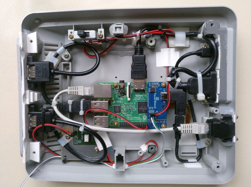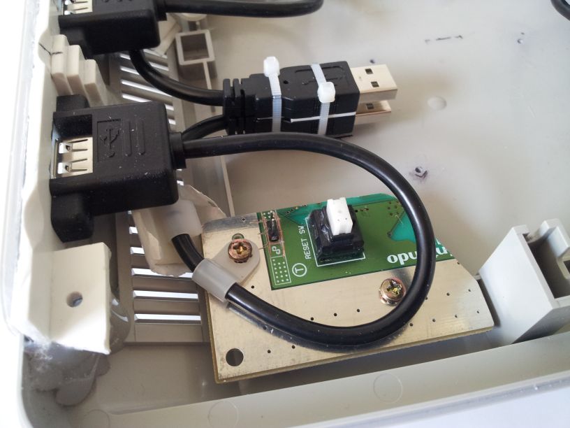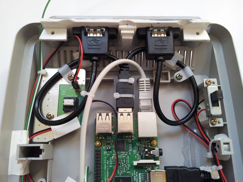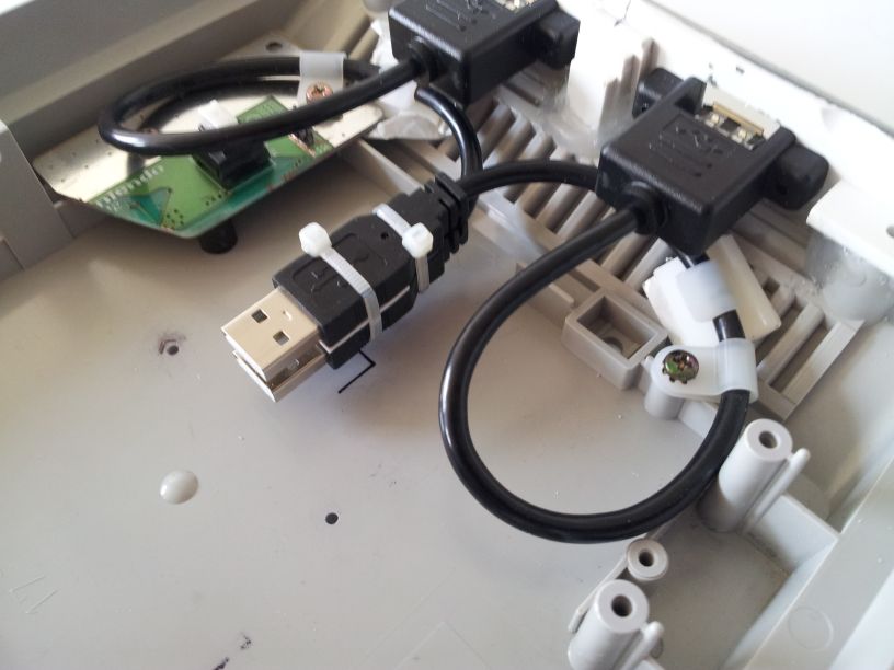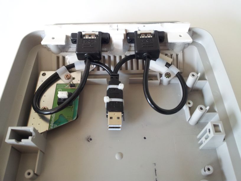 Zwei kurze USB-Verlängerungskabel mit montierbaren Buchsen kommen zum Einsatz. Die Buchsen werden an der selbstgebastelten Frontblende festgeschraubt. Zuvor wurde ein Teil der Originalfrontblende aufgeklebt, so wie weiter unten beschrieben. Die Kabel werden mit selbstklebenden Kabelclips am Gehäuse sowie mit Kabelschellen und Originalschrauben an Originalschraubgewinden befestigt. Die Stecker werden so durch ein Plättchen auf Abstand gehalten und mit Kabelbinder fixiert, dass die beiden Stecker in die Buchsen des Raspi passen.