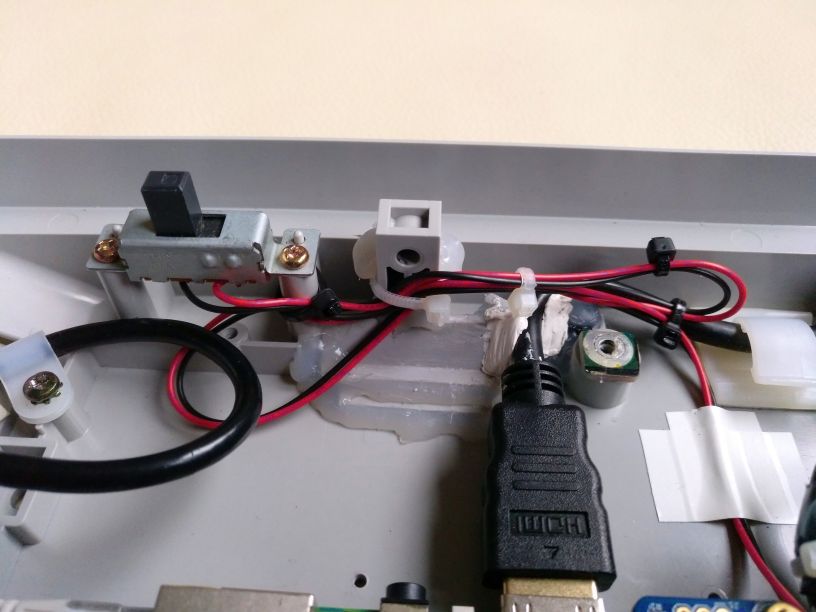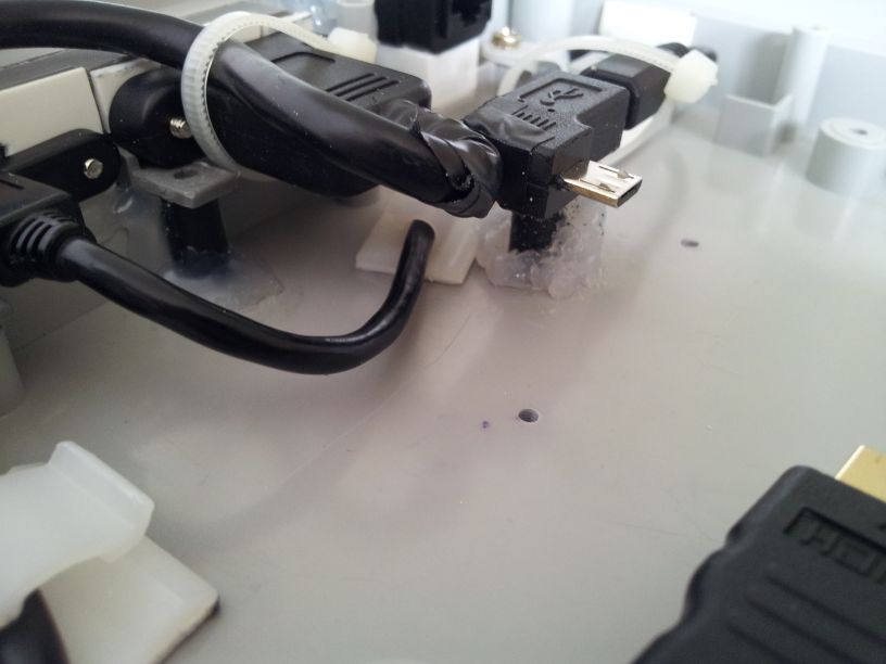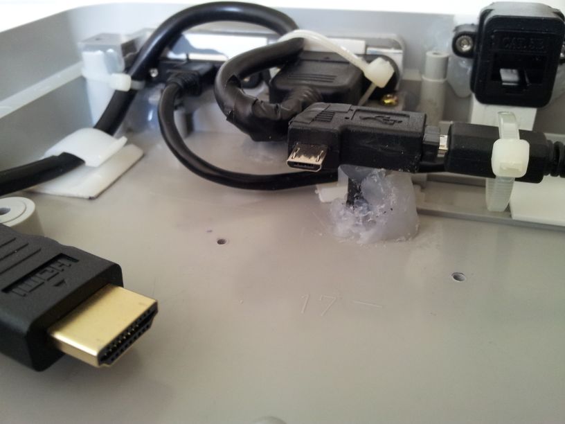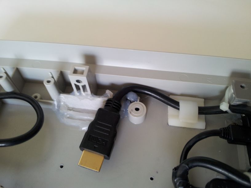 Das HDMI-Kabel ist sehr starr. Es muss daher stark gebogen und gut fixiert werden. Das Steckerende wird zwischen Schraubenführung und einem aus Plastikresten gebasteltem Sockel eingeklemmt. Der Sockel ist mit Plastikklebstoff und Heißkleber angebracht. Als Krümmer ist zusätzlich ein zylindrischer Abstandshalter am Gehäuserand zum Einsatz gekommen.