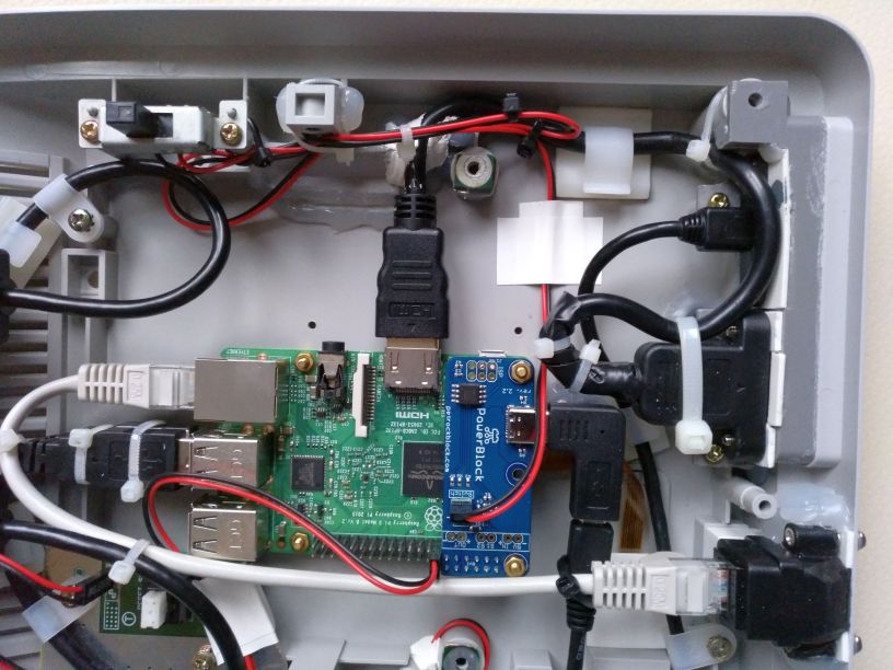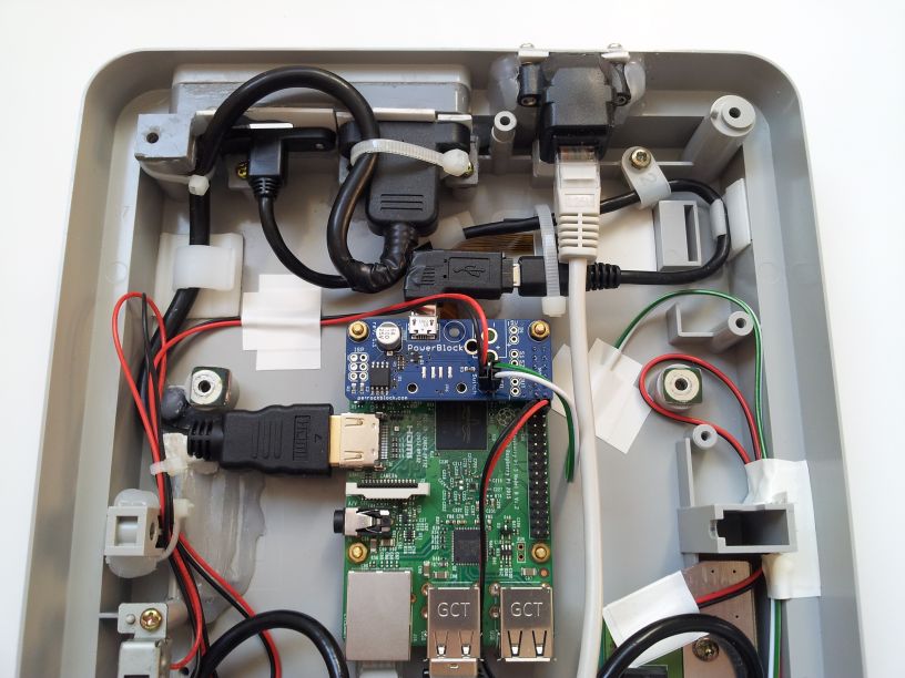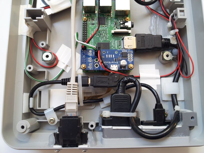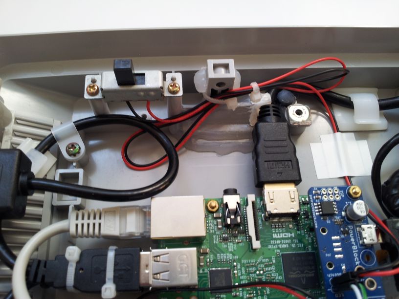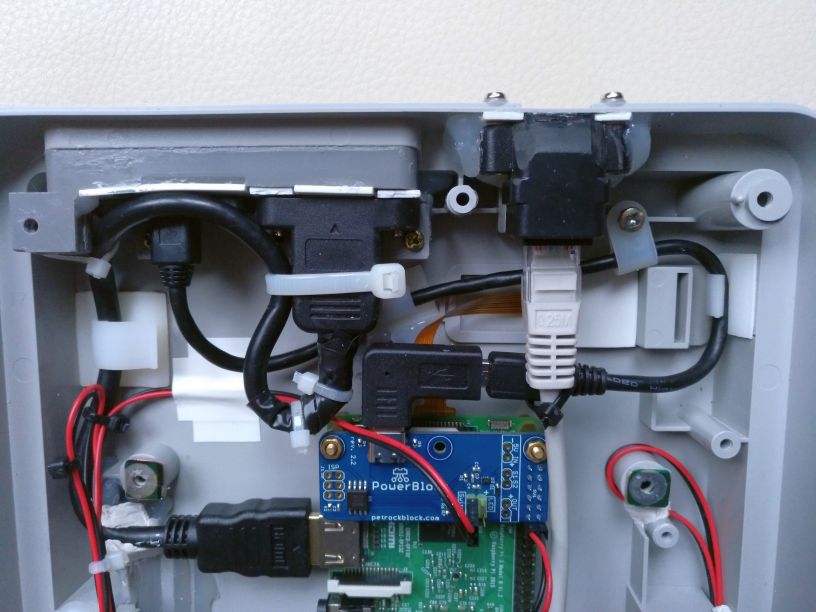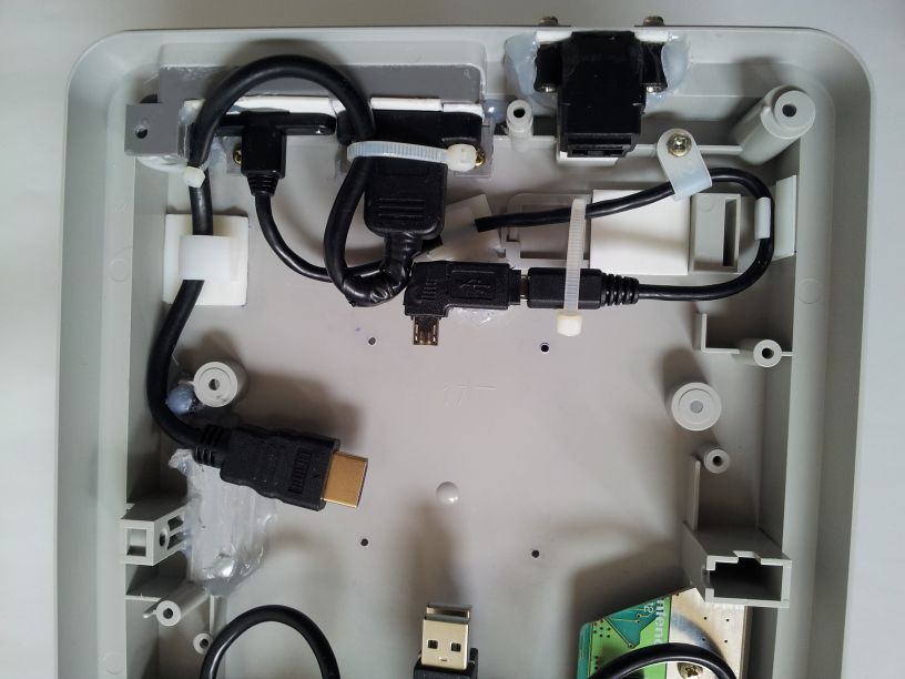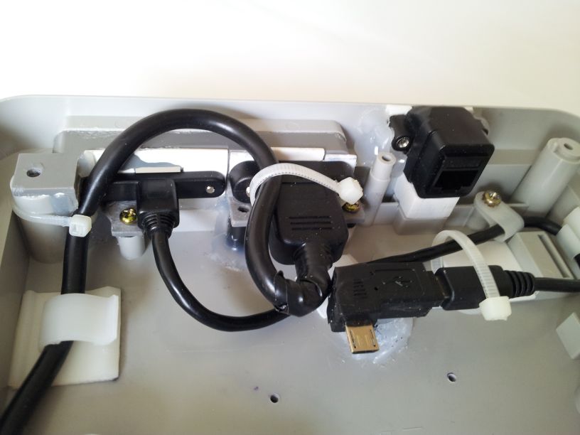 HDMI-Kabel und Stromanschluss, also Micro-USB-Verlängerungskabel, werden an der Rückblende festgeschraubt, mit Kabelschellen und selbstklebenden Kabelclips am Gehäuse befestigt, sowie mit Kabelbindern fixiert. Abstandshalter sind zurechtgesägt und -gefeilt worden.