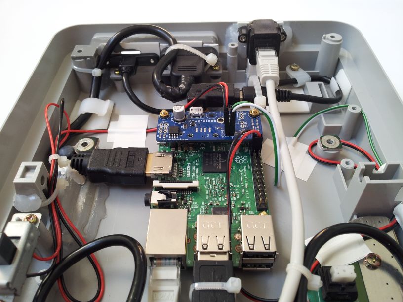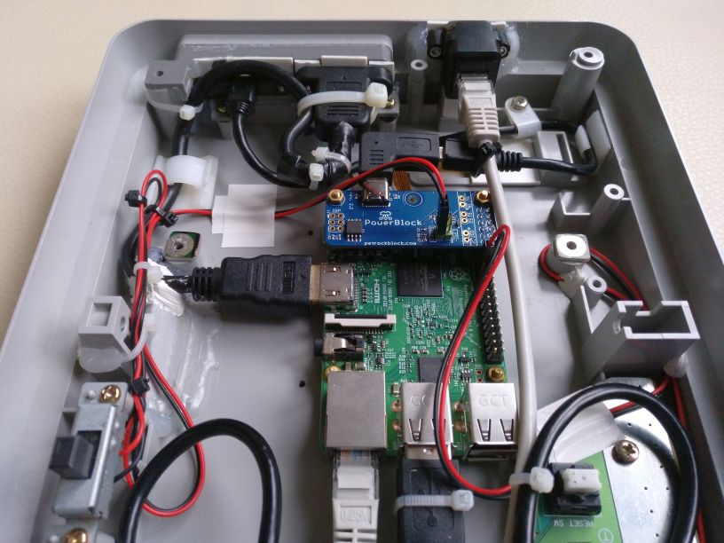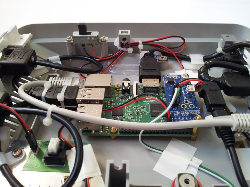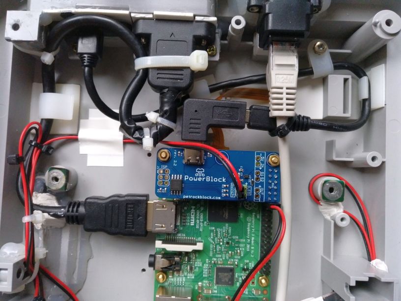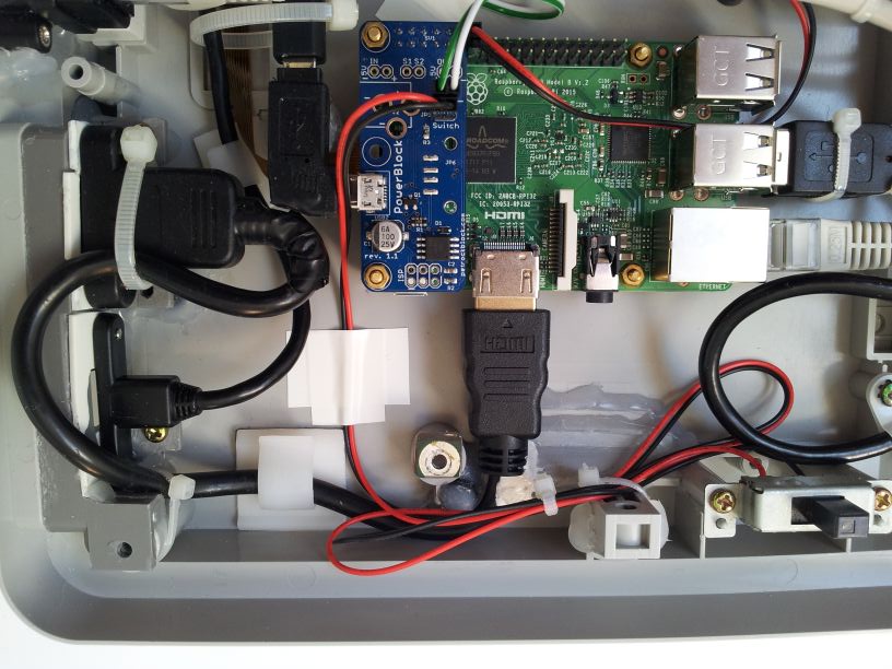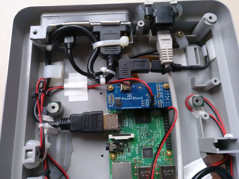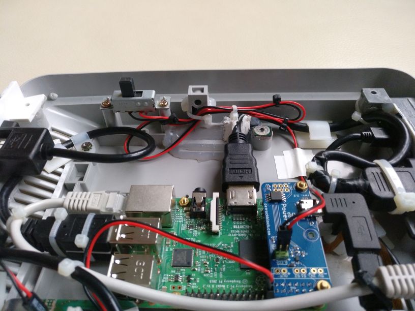 HDMI-Kabel und Stromanschluss, also Micro-USB-Verlängerungskabel, werden an der Rückblende festgeschraubt, mit Kabelschellen und selbstklebenden Kabelclips am Gehäuse befestigt, sowie mit Kabelbindern fixiert. Abstandshalter sind zurechtgesägt und -gefeilt worden.