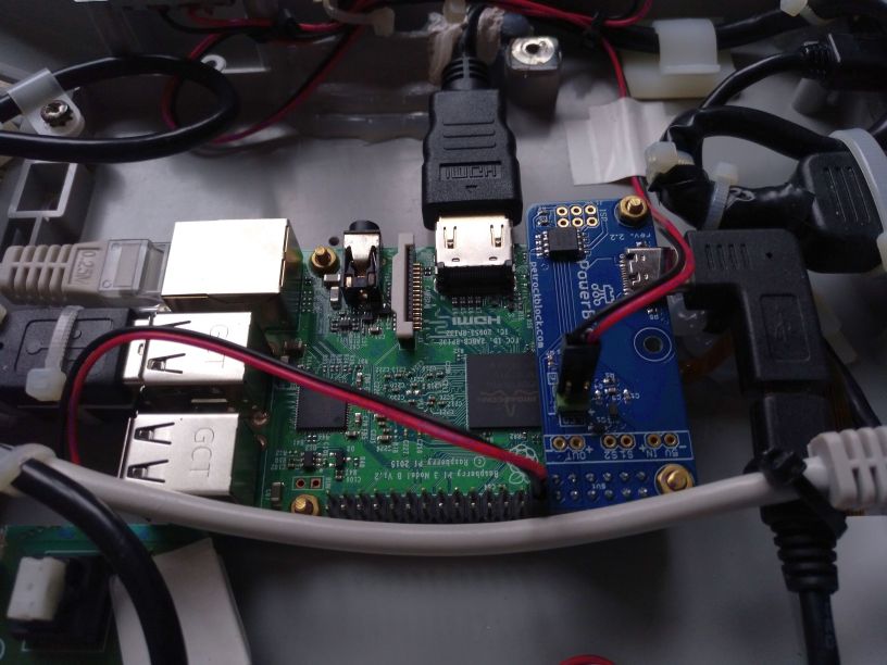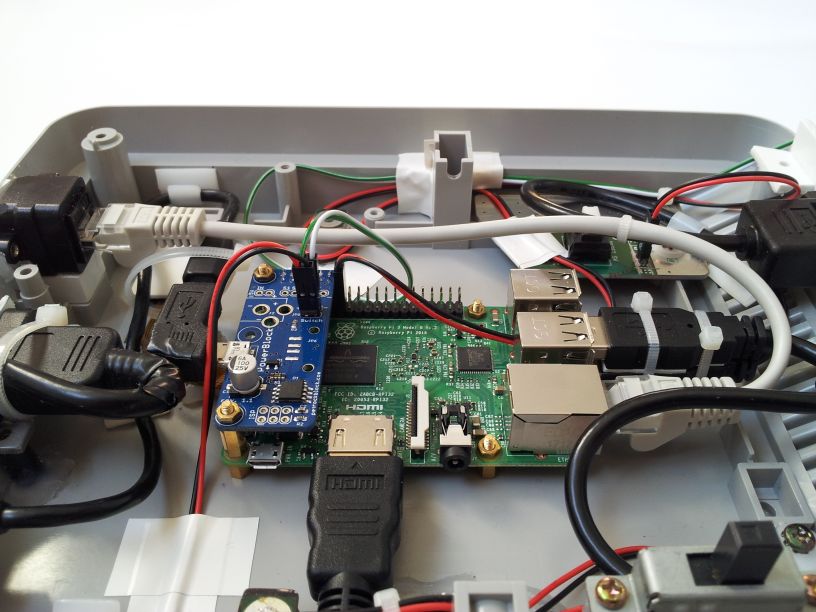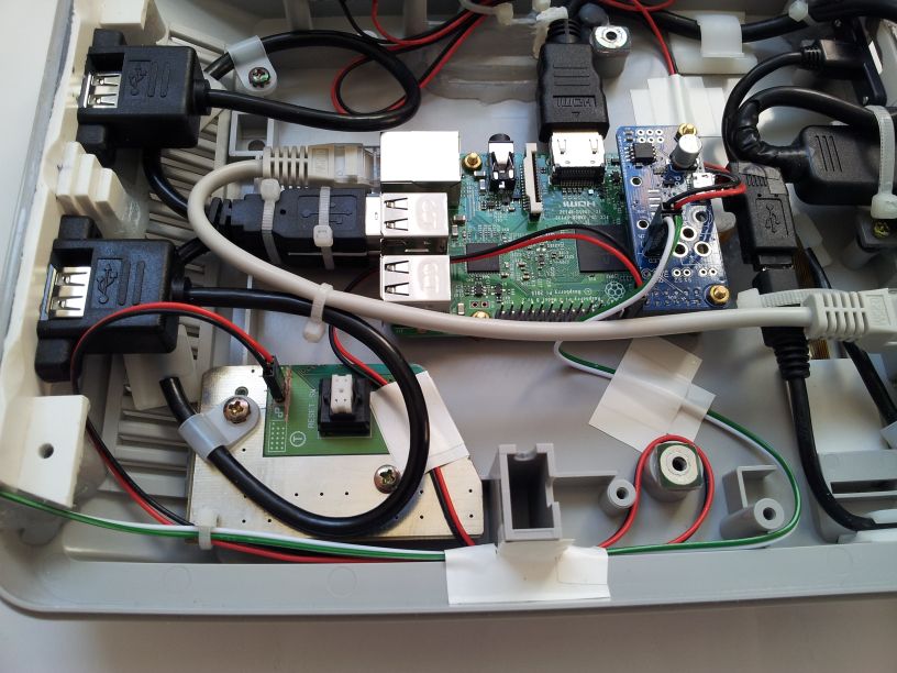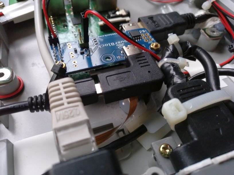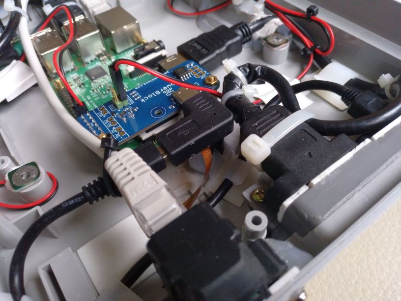 - Der HDMI-Stecker und der Micro-USB-90°-Adapter kommen sich gegenseitig ins Gehege, wie im Bild am oberen Rand in der Mitte zu sehen. Hier mussten Teile des Knickschutzes beim HDMI-Kabel entfernt werden, sowie der Adapter angefeilt werden. Das könnte man vermeiden, indem man den Raspberry Pi ein wenig nach rechts rückt, wobei man dann wiederum bei den USB-Anschlüssen aufpassen muss.