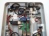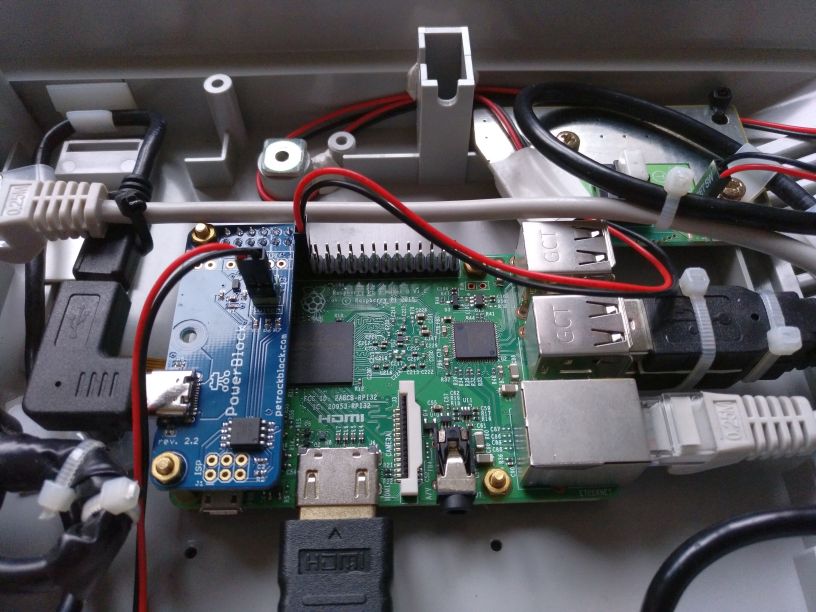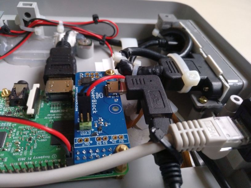Die Stromversorgung wird über einen 90°-Adapter mittels des PetRockBlock PowerBlock dem Raspberry Pi zugeführt. Der Adapter ruht mit Plastikklebstoff festgeklebt auf einem zylindrischen Abstandshalter, der mit Heißkleber am Gehäuseboden fixiert ist.