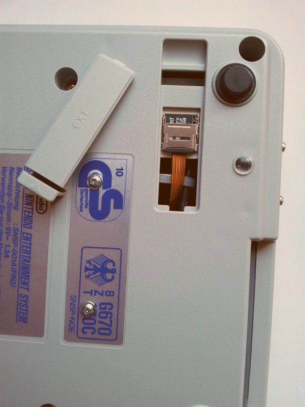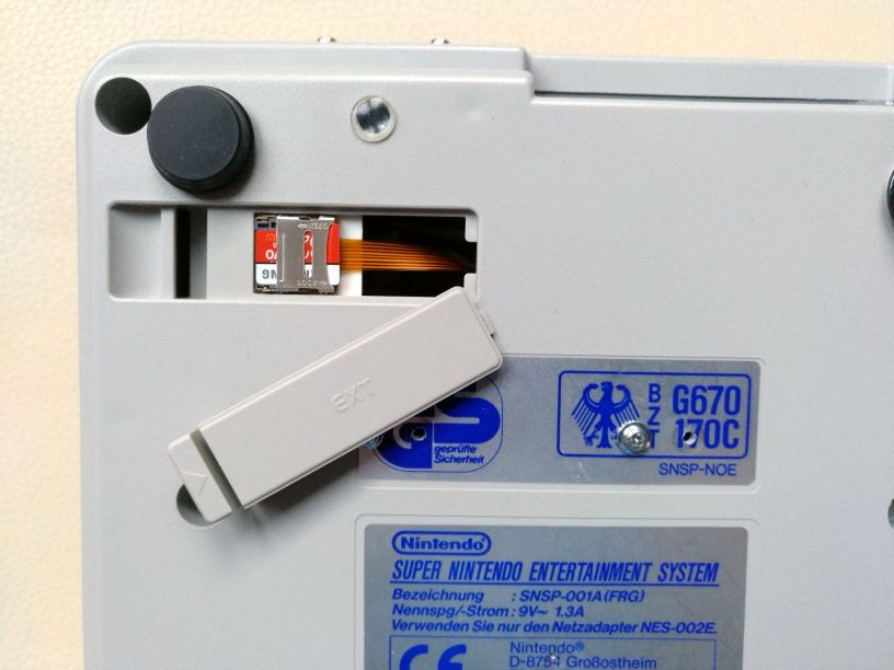 - Über dem SNES Extension Port, rechts oben im Bild, ist ein Plättchen aus Polystyrol aufgeklebt. Dadurch entsteht ein Fach, welches einen Micro-SD-Kartensteckplatz am Ende eines Verlängerungskabels aufnehmen kann. Die Abdeckung des Ports ist abnehmbar, dadurch ist der Steckplatz von außen zugänglich.